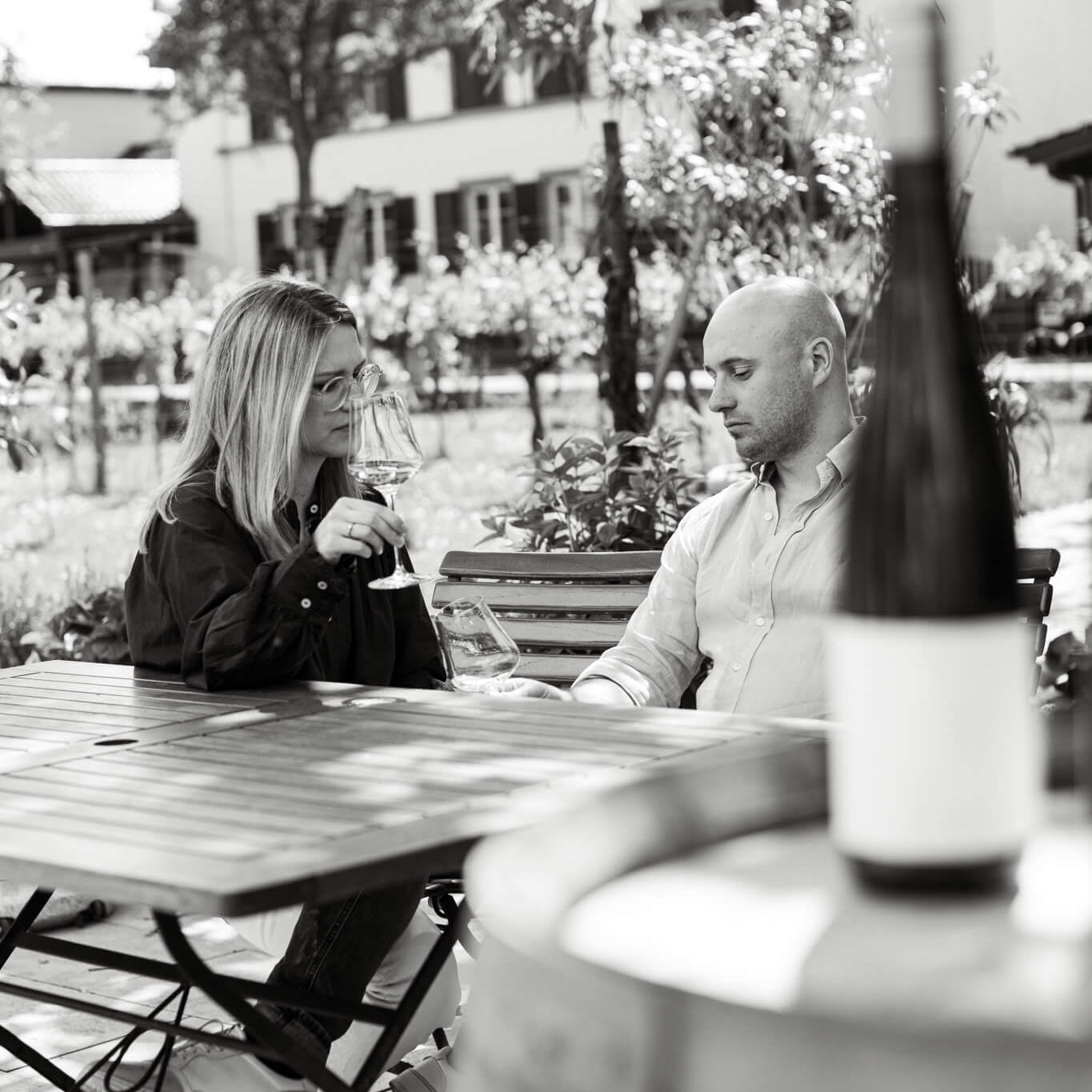 Gerne kannst du uns im Weingut besuchen und unsere Weine während der Öffnungszeiten an der Theke probieren. Von Dienstag bis Freitag zwischen 10 und 12 Uhr sowie 14 und 18 Uhr, samstags von 10 bis 16 Uhr, stehen unsere Weine zur Verkostung bereit. Die Verkostung an der Theke berechnen wir mit 10 €, die bei einem Einkauf verrechnet werden. Was dir gefällt, kannst du direkt mitnehmen.